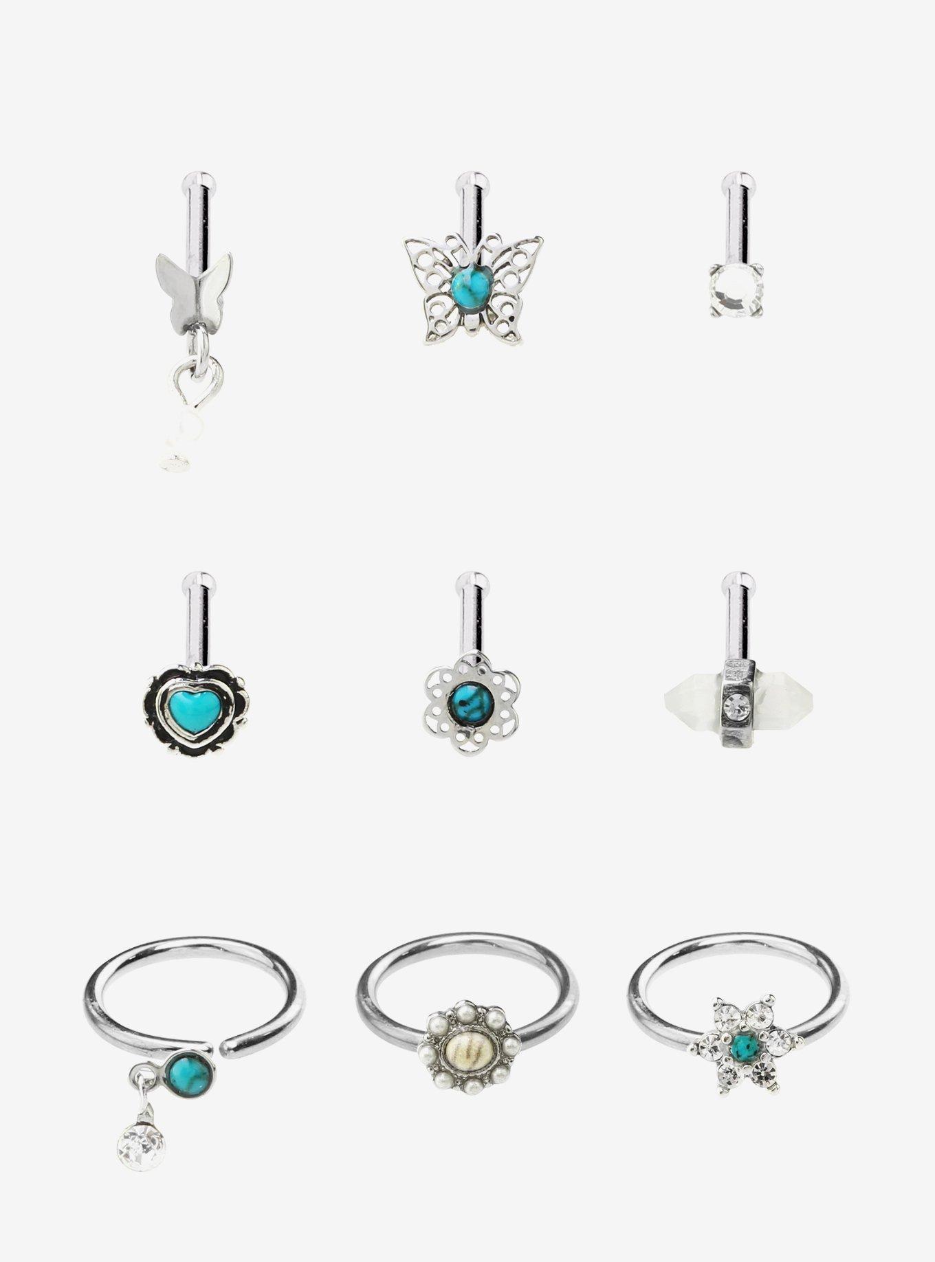 Price: $15.12 | lt div gt silver-tone set including 6 nose studs and 3 hoops with butterfly heart and gem designs plus clear and turquoise gem accents. lt div gt lt div gt lt b gt lt br gt lt b gt lt div gt lt div gt lt b gt jewelry care lt b gt nbsp wash with antibacterial soap and warm water.nbsp lt div gt lt div gt lt br gt lt div gt lt div gt lt div gt lt b gt piercing care lt b gt nbsp wash hands thoroughly then clean piercing with h2ocean 40 sold separately 41 or saline solution.nbsp lt div gt lt div gt lt ul gt lt li style margin 0px padding 0px box-sizing border-box gt 316l surgical steel - may contain some nickel lt li gt lt li style margin 0px padding 0px box-sizing border-box gt set of 9 lt li gt lt li gt use in healed piercings only. remove immediately if irritation occurs.nbsp lt li gt lt li gt do not use harsh or alcohol-based chemicals to clean jewelry. this may cause tarnishing. lt li gt lt li gt intended as a decorative piece and should not be worn to sleep. lt li gt lt li style margin 0px padding 0px box-sizing border-box gt imported lt li gt lt ul gt lt div gt lt div gt steel | |