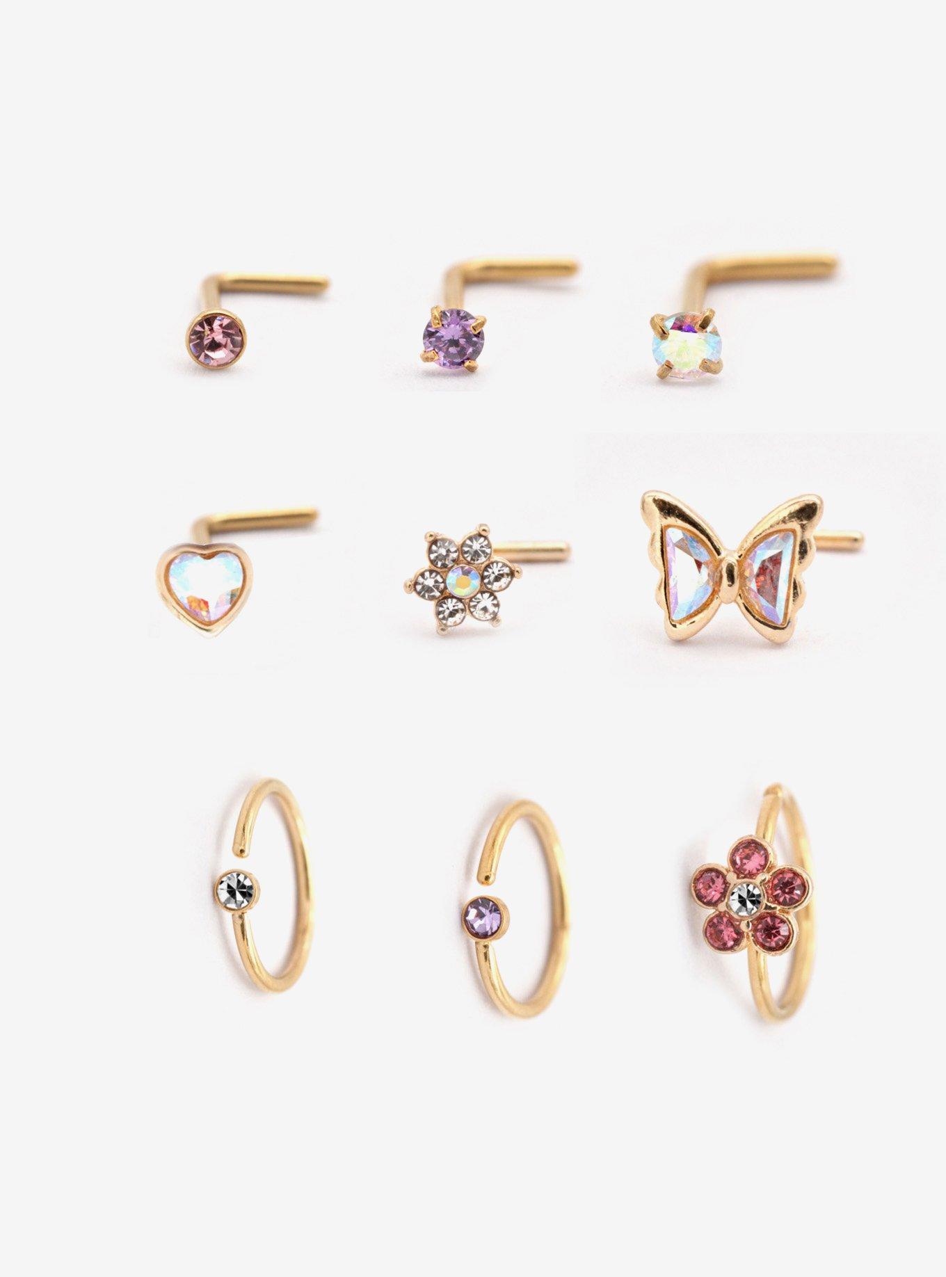 Price: $15.12 | lt div gt gold-tone set includes 6 nose studs and 3 nose hoops with butterfly flower and heart designs plus pink purple and iridescent gem detailing. lt div gt lt div gt lt b gt lt br gt lt b gt lt div gt lt div gt lt b gt jewelry care lt b gt nbsp wash with antibacterial soap and warm water.nbsp lt div gt lt div gt lt br gt lt div gt lt div gt lt div gt lt b gt piercing care lt b gt nbsp wash hands thoroughly then clean piercing with h2ocean 40 sold separately 41 or saline solution.nbsp lt div gt lt div gt lt ul gt lt li style margin 0px padding 0px box-sizing border-box gt 316l surgical steelnbsp lt li gt lt li style margin 0px padding 0px box-sizing border-box gt nickel-free alloy lt li gt lt li style margin 0px padding 0px box-sizing border-box gt 2mm - 5.5mm gem stones lt li gt lt li style margin 0px padding 0px box-sizing border-box gt set of 9 lt li gt lt li gt use in healed piercings only. remove immediately if irritation occurs.nbsp lt li gt lt li gt do not use harsh or alcohol-based chemicals to clean jewelry. this may cause tarnishing. lt li gt lt li gt intended as a decorative piece and should not be worn to sleep. lt li gt lt li style margin 0px padding 0px box-sizing border-box gt imported lt li gt lt ul gt lt div gt lt div gt steel | |