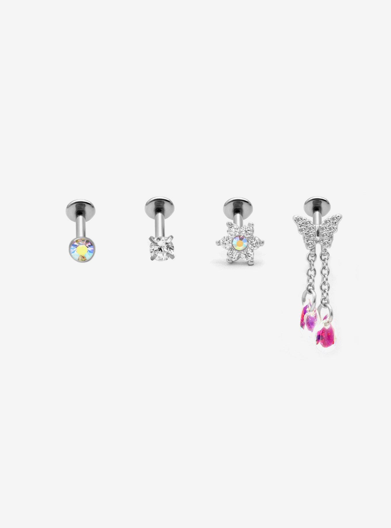 | lt div gt silver-toned cartilage stud set featuring clear and iridescent cz gems a flower shape and a blinged out butterfly with beaded drops. lt div gt lt div gt lt br gt lt div gt lt div gt lt b gt jewelry care lt b gt wash with antibacterial soap and warm water. lt br gt lt br gt lt b gt piercing care lt b gt wash hands thoroughly then clean piercing with h2ocean 40 sold separately 41 or saline solution. lt br gt lt ul gt lt li gt 316l surgical steel lt li gt lt li gt nickel-free lt li gt lt li gt 3mm - 5mm gem stones lt li gt lt li gt 6-10mm length lt br gt lt li gt lt li gt set of 4 lt li gt lt li gt use in healed piercings only. remove immediately if irritation occurs. lt li gt lt li gt do not use harsh or alcohol-based chemicals to clean jewelry. this may cause tarnishing. lt li gt lt li gt intended as a decorative piece and should not be worn to sleep. lt li gt lt li gt imported lt li gt lt ul gt lt br gt lt div gt steel