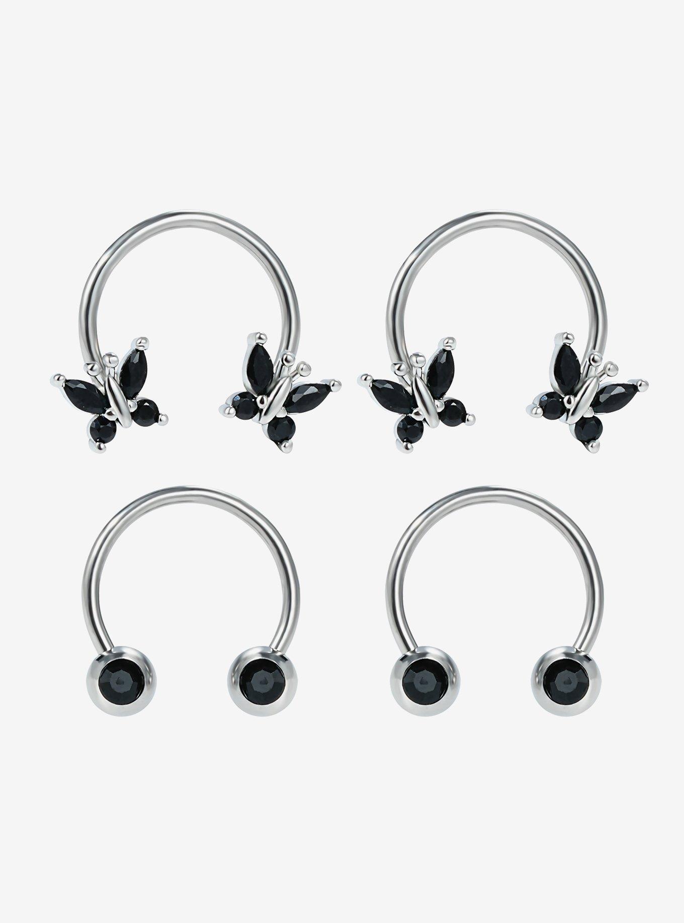 | lt div gt silver-tone set featuring 4 circular barbells with butterfly and ball ends plus black gem accents. lt div gt lt b gt lt div gt lt b gt lt br gt lt b gt lt div gt jewelry care lt b gt nbsp wash with antibacterial soap and warm water. lt br gt lt br gt lt b gt piercing care nbsp lt b gt wash hands thoroughly then clean piercing with h2ocean 40 sold separately 41 or saline solution. lt br gt lt ul gt lt li gt 316l surgical steel- may contain some nickelnbsp lt li gt lt li gt 1mm - 4mm gems lt li gt lt li gt set of 4 lt li gt lt li gt use in healed piercings only. remove immediately if irritation occurs. do not use harsh or alcohol-based chemicals to clean jewelry. this may cause tarnishing. lt li gt lt li gt intended as a decorative piece and should not be worn to sleep. lt li gt lt li gt imported lt li gt lt ul gt steel