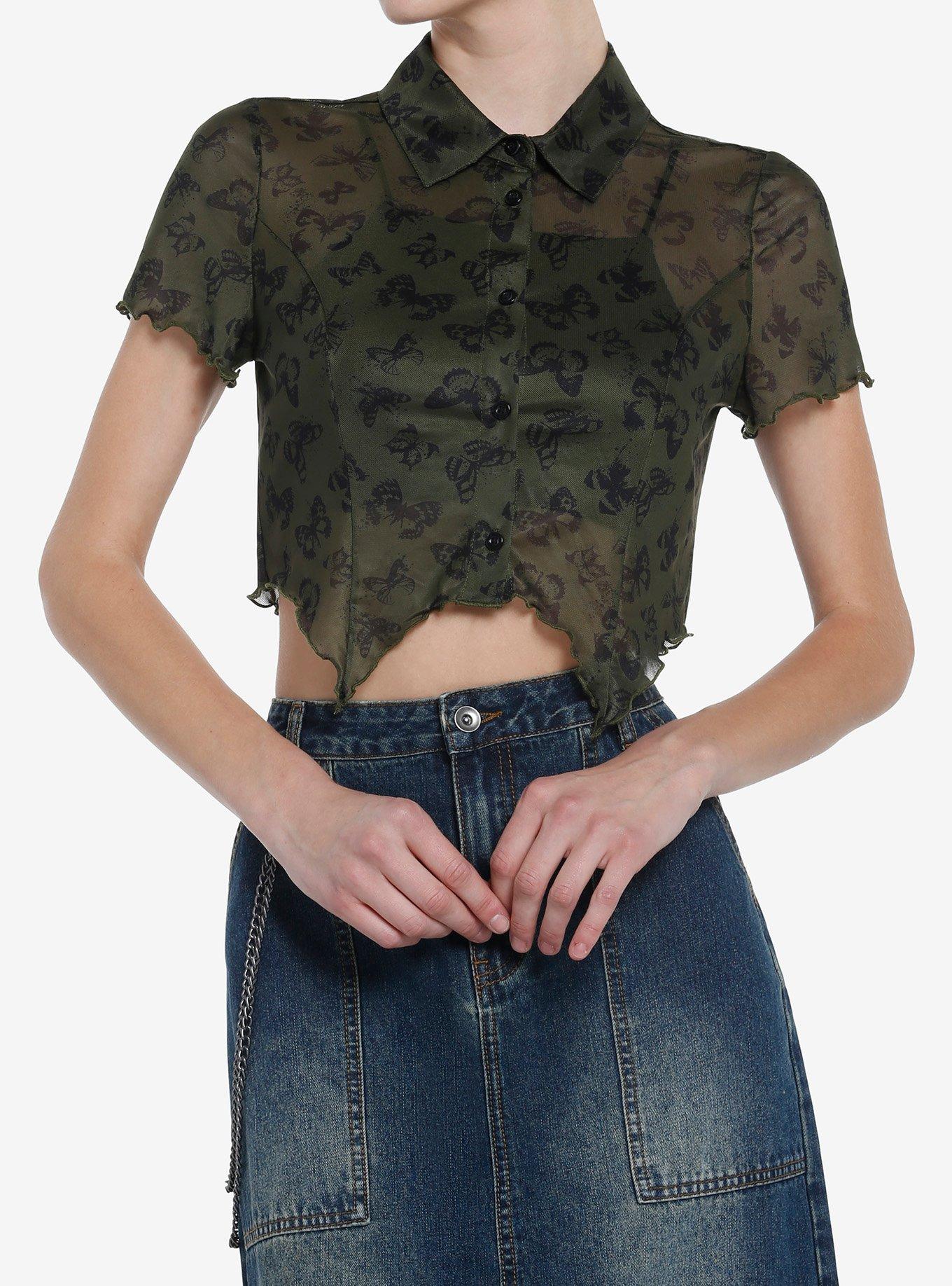 Price: $18.99 | lt div gt something edgy is ready to flutter into your wardrobe this cropped button-up has black butterflies all over a dark green mesh material and comes with lettuce trim on the hems and a jagged hem cut around the waist. lt div gt lt div gt lt ul gt lt li gt 95 polyester 5 spandex lt li gt lt li gt wash cold dry low lt li gt lt li gt length 15 lt li gt lt li gt cropped fit lt li gt lt li gt stretchy material lt li gt lt li gt imported lt li gt lt li gt listed in junior sizes lt li gt lt li gt model is 5 39 10 lt li gt lt li gt model wears size small lt li gt lt ul gt lt div gt 95 polyester 5 spandex | |