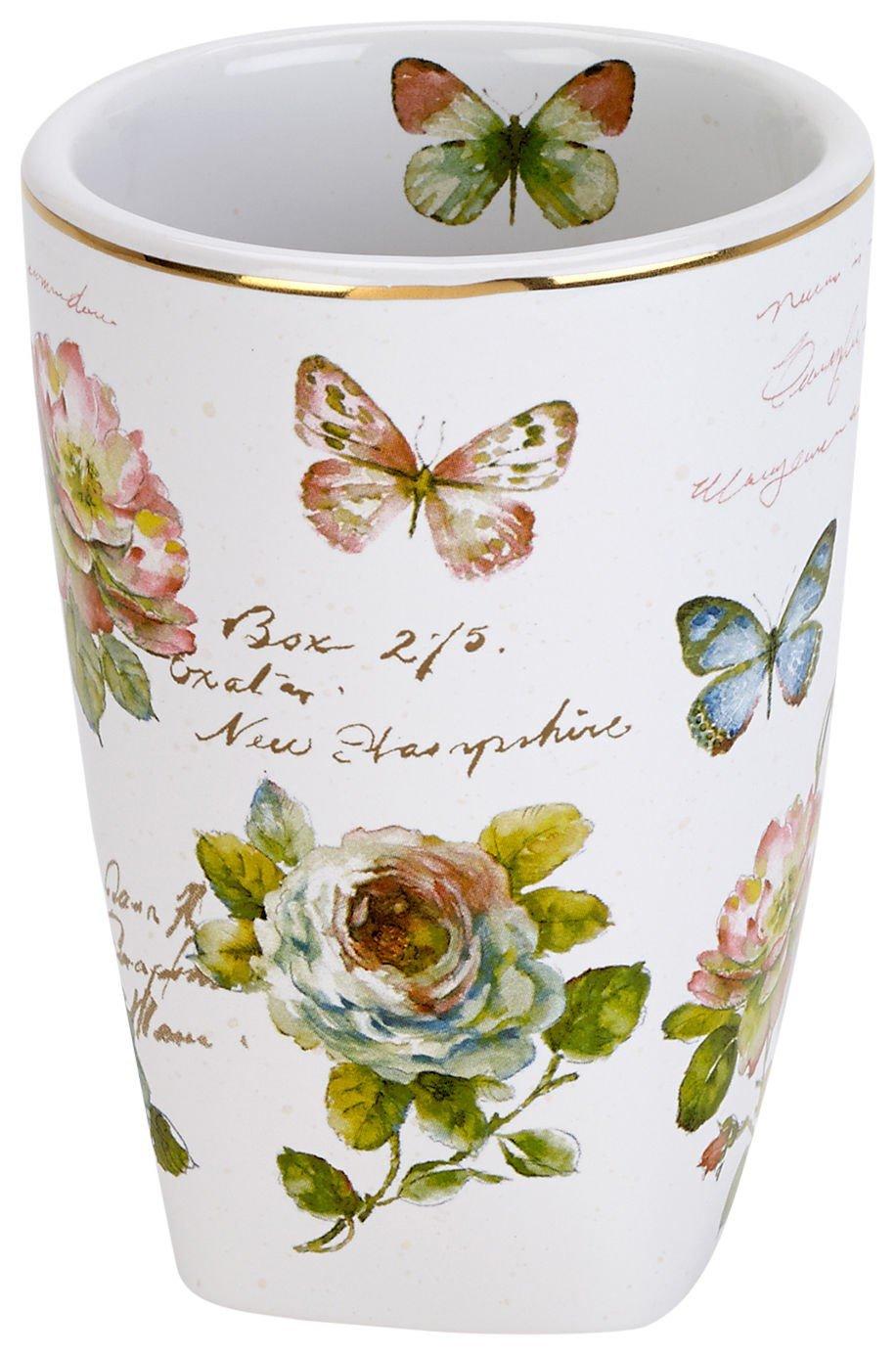 Price: $18.00 | Butterfly Garden Tumbler is decorated with an intricately detailed rose and butterfly design on a ceramic base and finished with gold piping. Tumbler measures 3.1 x 3.1 x 4.5 . |
