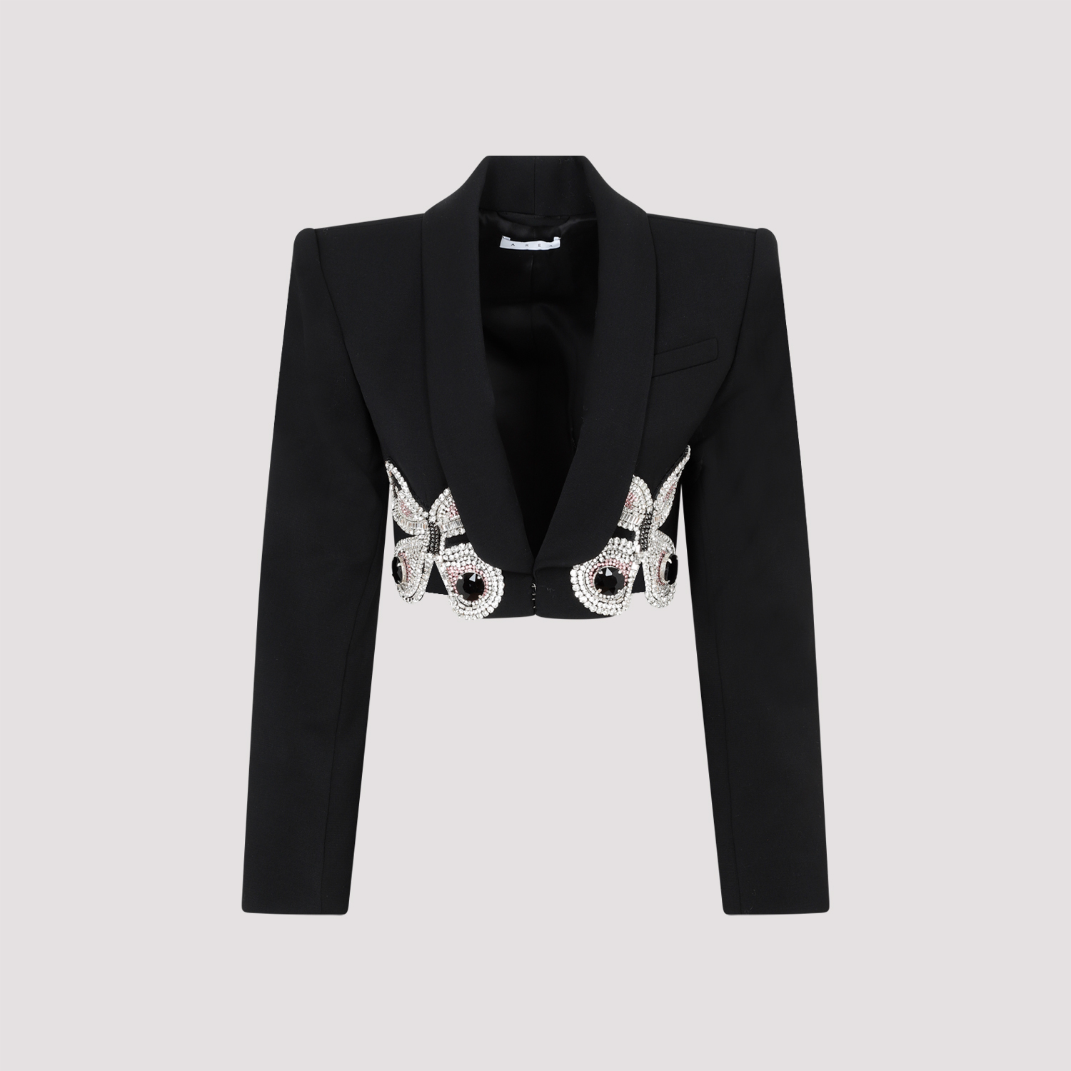 Price: $1.00 | Black Wool Embroidered Butterfly Cropped Blazer Black Wool Embroidered Butterfly Cropped Blazer. Crafted in virgin wool and Lycra blend. Notched collar, crystal butterfly details on the front, cropped style, long sleeves, tonal buttoned cuffs. Made in China. Fabric/Material: Wool - 99%VIRGIN WOOL 1%LYCRA. |