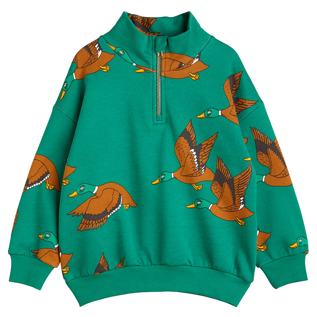 | a Swedish organic childrens wear brand founded in 2005 by illustrator Cassandra Rhodin. The brand is a tribute to all children, their imagination and sense that everything is possible. The collections take children seriously with a playfulness that matches your child own personality and mood. - Green sweatshirt with all over ducks print - High neck - Half zip closure at the front - Ribbed knit trim - Long sleeves with dropped shoulders 100% Organic Cotton 2272000975
