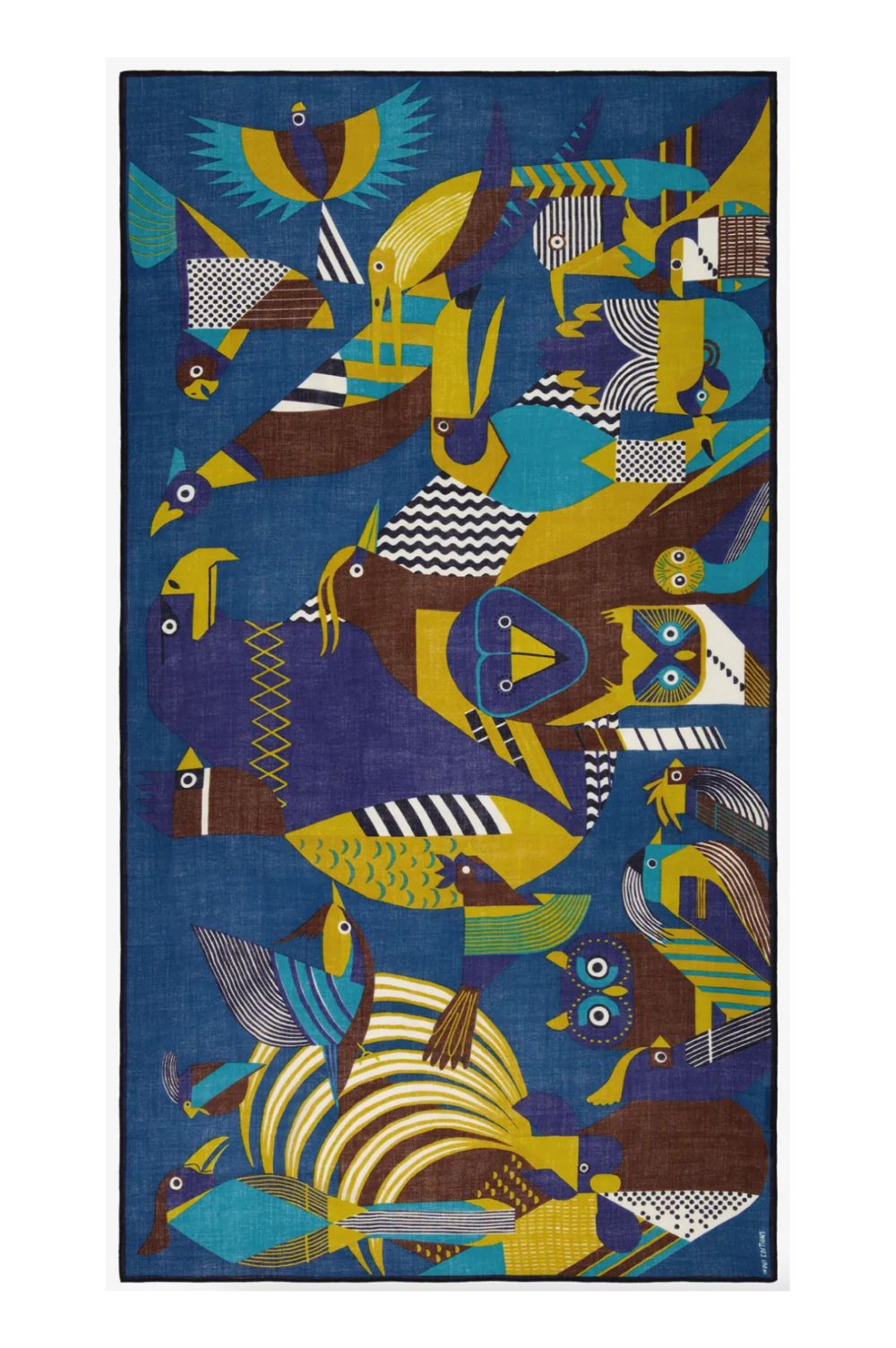 | Colour-blocked, graphic birds in duck blue, ochres and browns. Duck-blue background. 100% wool. 100 x 190 cm. Dry clean or hand wash cool, lay flat to dry. Made in India. SHOP ALL INOUI EDITIONS