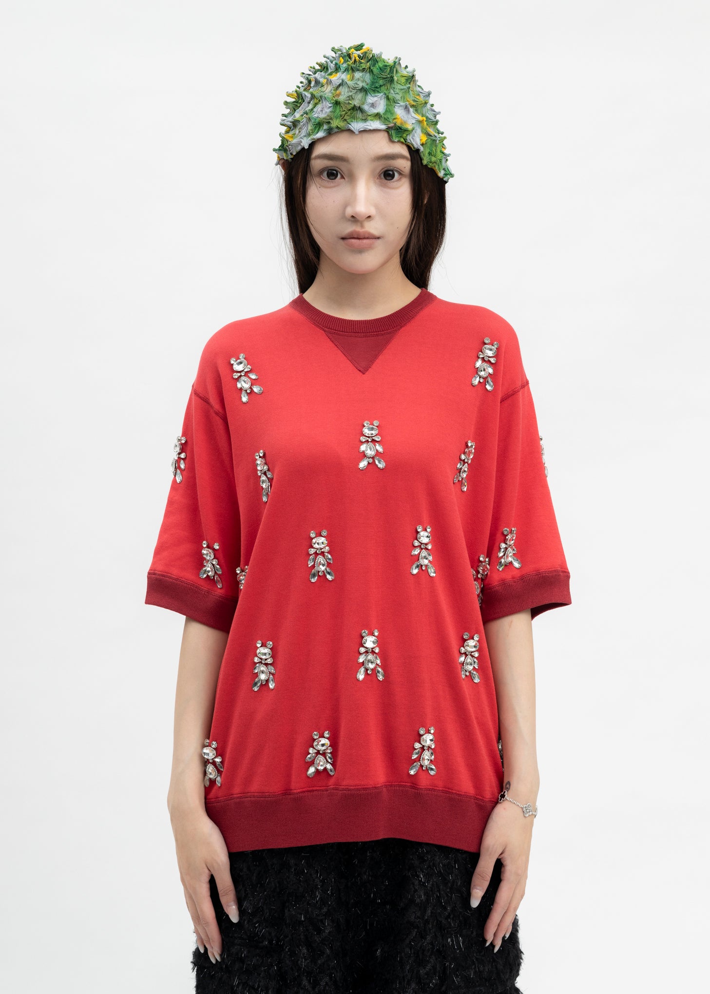 Price: $502.00 | Bijoux bear knit T-shirt in red, from MASU. Features a relaxed construction with silver-tone crystal bear-shaped detailing throughout. Rib-knit trim throughout. Finished with contrast stitching in black throughout. Relaxed Fit 100% Cotton Imported Model is wearing size 46 Model is 5 7 (172 cm), 98 pounds (44kg), usually wears S in tops. A size 25 in denim and S in trousers. Size 8 in shoe |