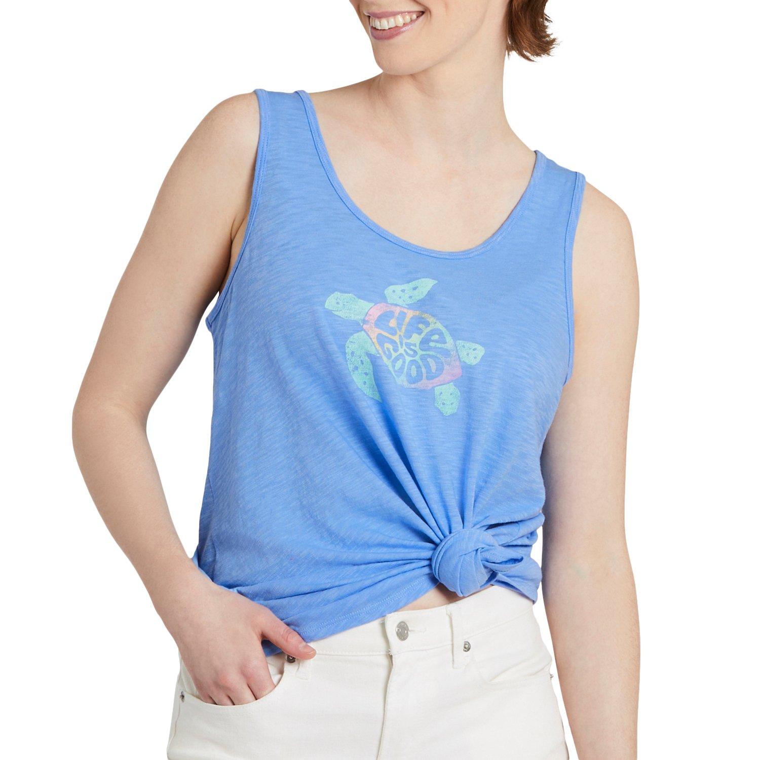 Price: $28.50 | embodies the simple things in life & offers inspirational messages! This ultra-soft slub tank is a new twist on an old favorite and features a knotted front detail, scoop neckline, and a textured turtle front screen print. |