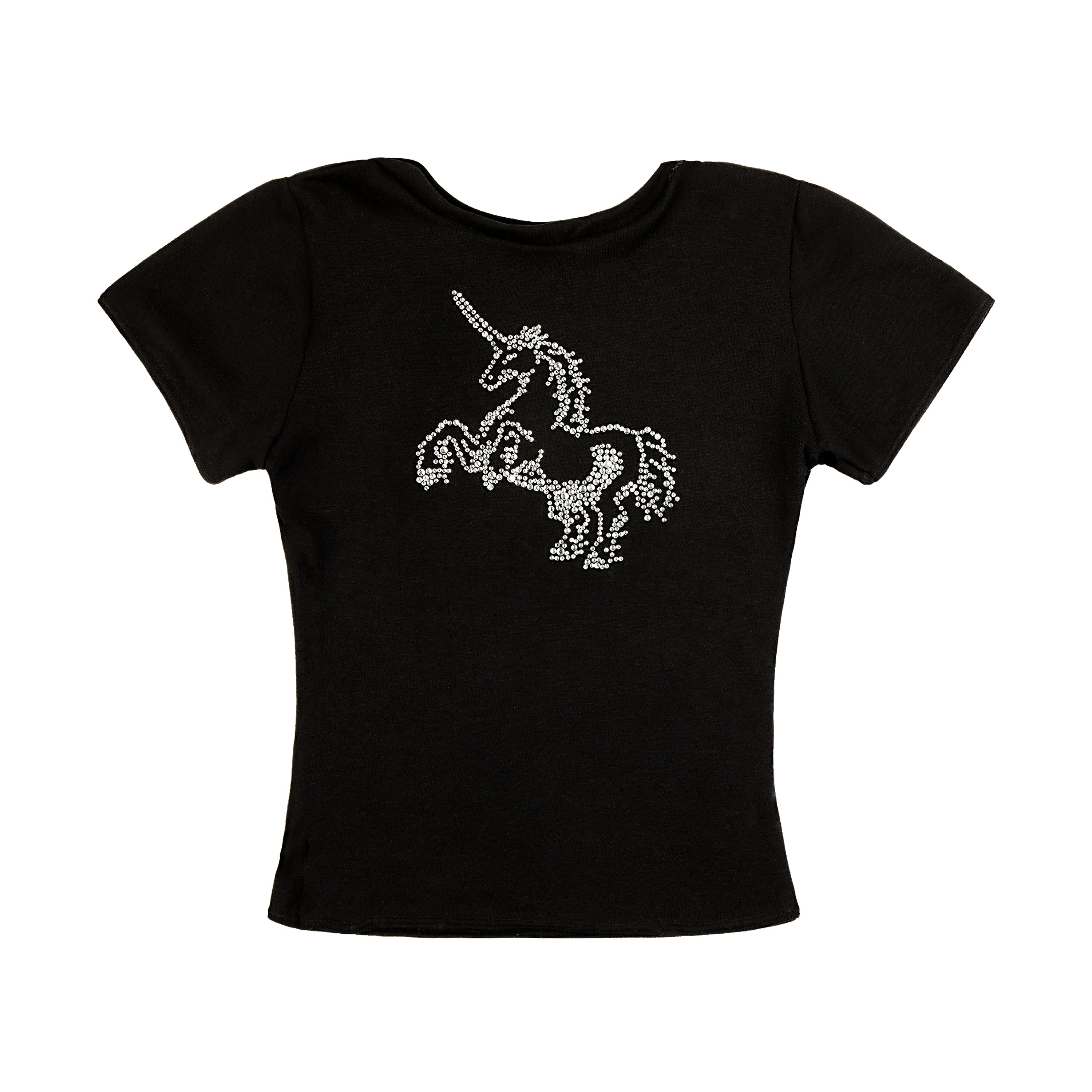 | Black tshirt with a silver rhinestone outline of a unicorn. 100% viscose jersey