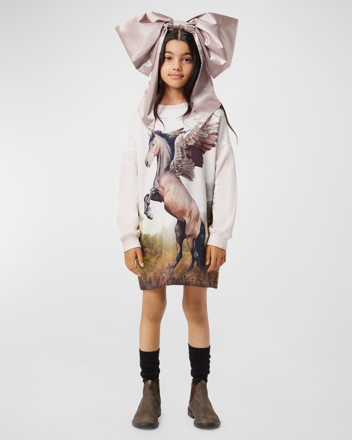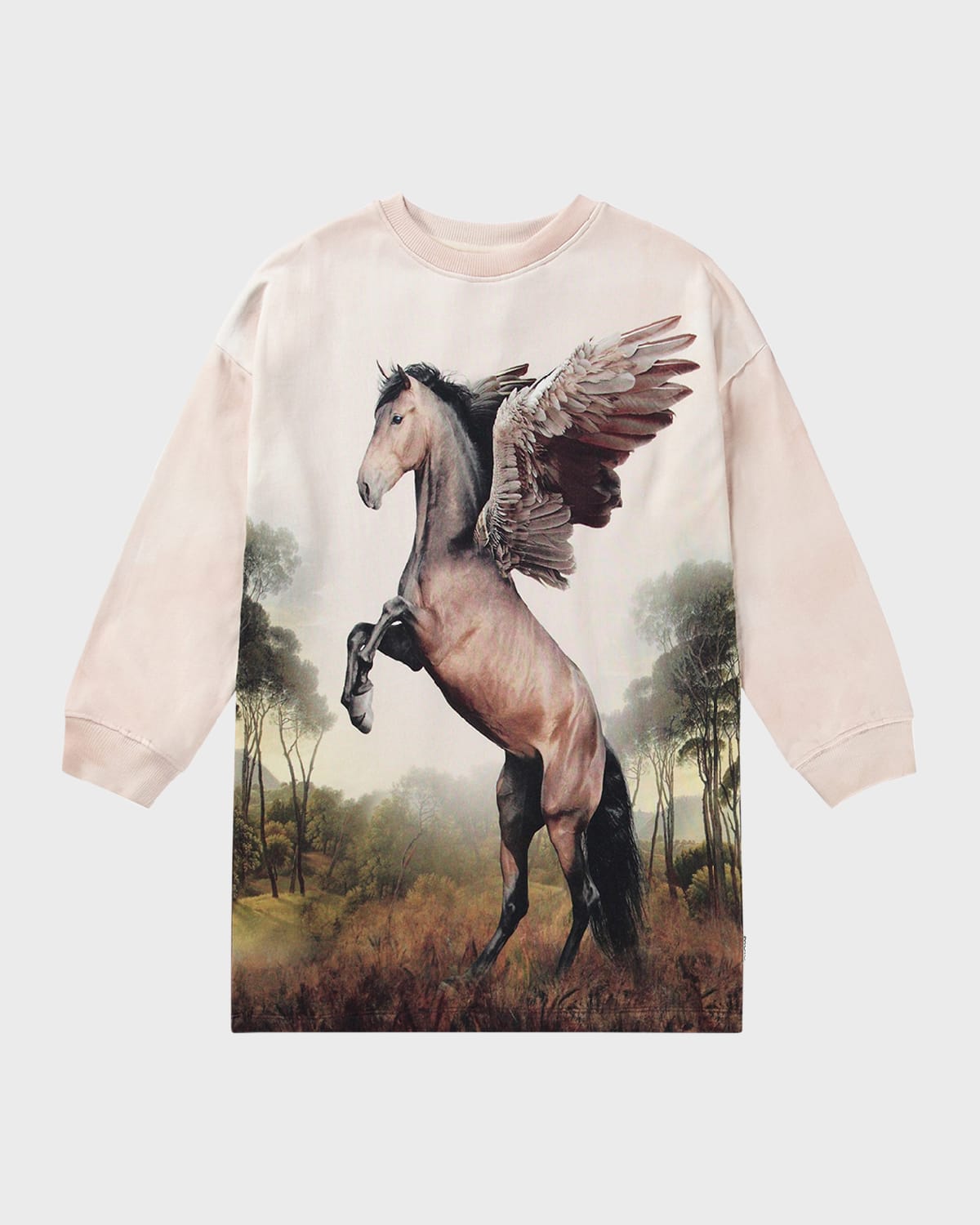 | cyrella tshirt dress with unicorn graphic at the front crew neckline long sleeves banded cuffs hem hits around the knee aline silhouette cotton imported