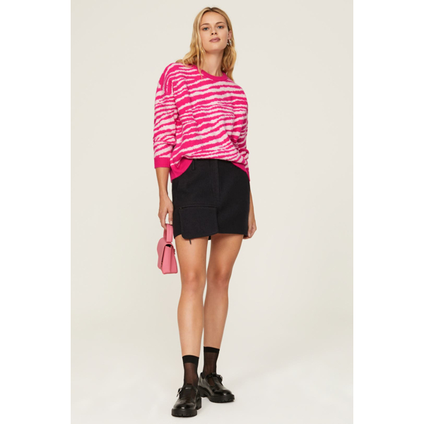 | Pink zebra knit (52% Acrylic, 28% Nylon, 20% Polyester). Sweater. Long sleeves. Crewneck. Pull on. 23.5 from shoulder to hemline. Imported.