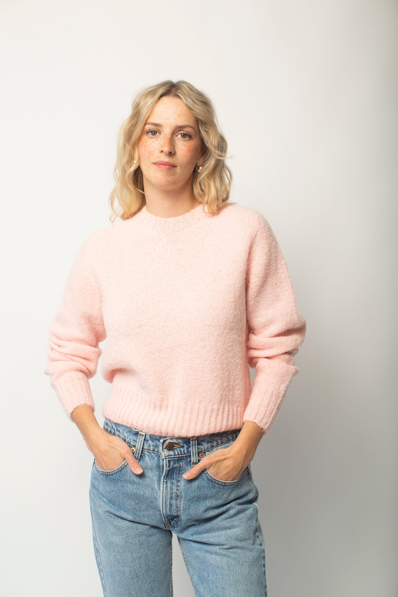 Price: $240.00 | The coziest alpaca blend round neck knit pullover. Featuring a naturally falling sleeve line and a relaxed silhouette. It is made in a sewing-free holgarment method without sewing lines for a soft and natural fit. - 65% Alpaca, 22% Acrylic, 11% Nylon, 2% Polyurethane - Made in Korea |