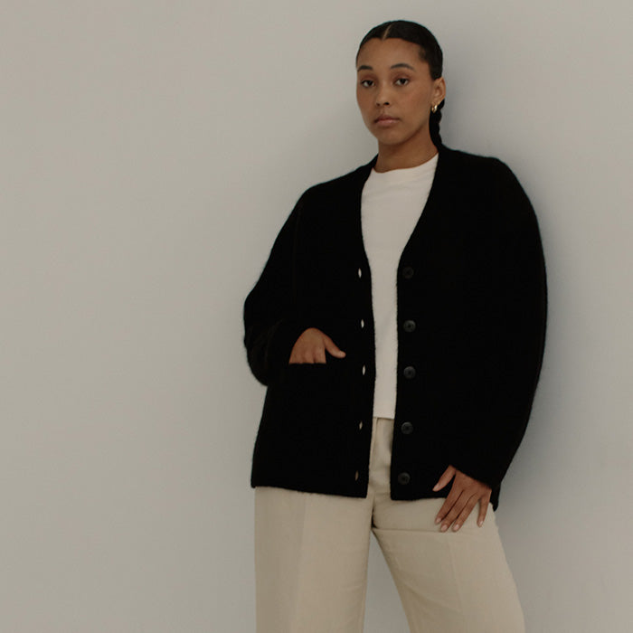 Price: $235.00 | Produced in Peru in collaboration with local artisan communities, is a Canadian brand designing luxurious, heirloom knitwear that merges heritage artisanship with modern design. - Classic knit cardigan - Mid weight - Dyed with oeko-tex certified, low impact dyes - Button closure down the front - Two large patch pockets on the front - Double face jaquard stitch - Long sleeves with dropped shoulders - Ethically made in Lima, Peru on a manual knitting machine 100% baby alpaca Hand wash in cool water using a neutral soap. Re-shape and lay flat to dry. Image Credit © Britney Gill Photography 2023 |