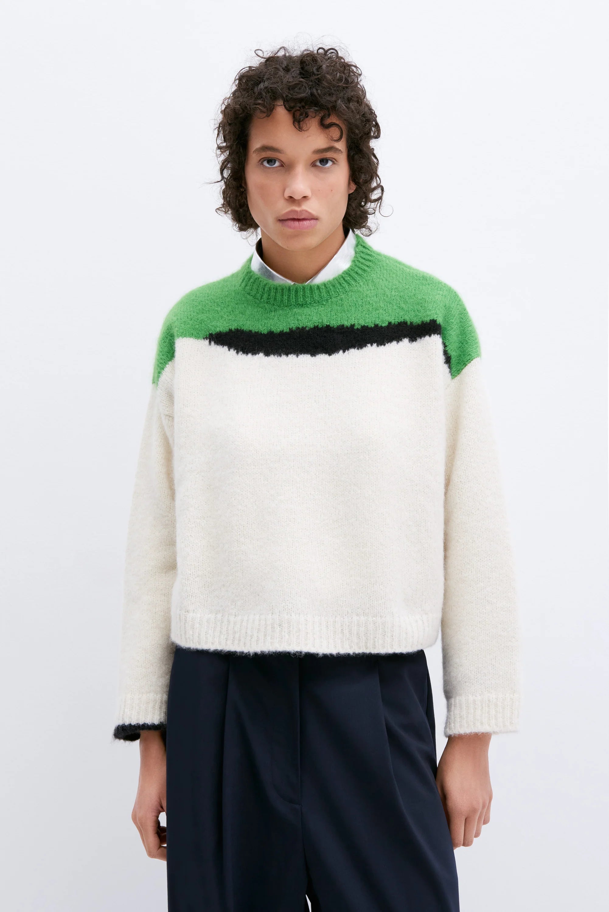 Price: $354.00 | This sweater is knitted from an alpaca blend that soft, warm and tactile. Designed with a cropped fit, round neck and neat ribbed trims. It the perfect basic but with touches of color in green and black. This sweater is ethically and carefully manufactured in La Coruña, with Japanese knitting machines and finished by hand. We care about the environment using recycled yarns with traceability certified and low environmental impact production cycle. . Made in Spain . Yarn 55% Baby Alpaca 25% Recycled Polyamide 20% Extrafine Merino Wool Green Yarn 78% Suri Alpaca 22% Recycled Polyamide . Dry Cleaning . SIZE ONE. Size range runs as 34 EU size to 40 EU size . SIZE TWO. Size range runs as 40 EU size to 44 EU size . Model is 5 8 wearing Size One |