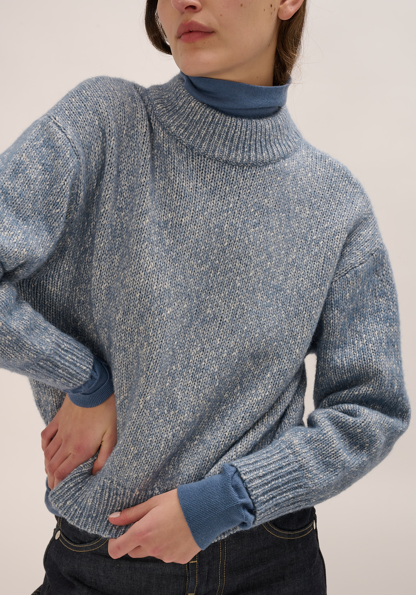 Price: $360.00 | Relaxed fit sweater in speckled alpaca blend. 60% alpaca, 20% cotton, 20% wool Photographed in size small: Body length 21 Chest width 23 Sleeve length from shoulder 19.5 |
