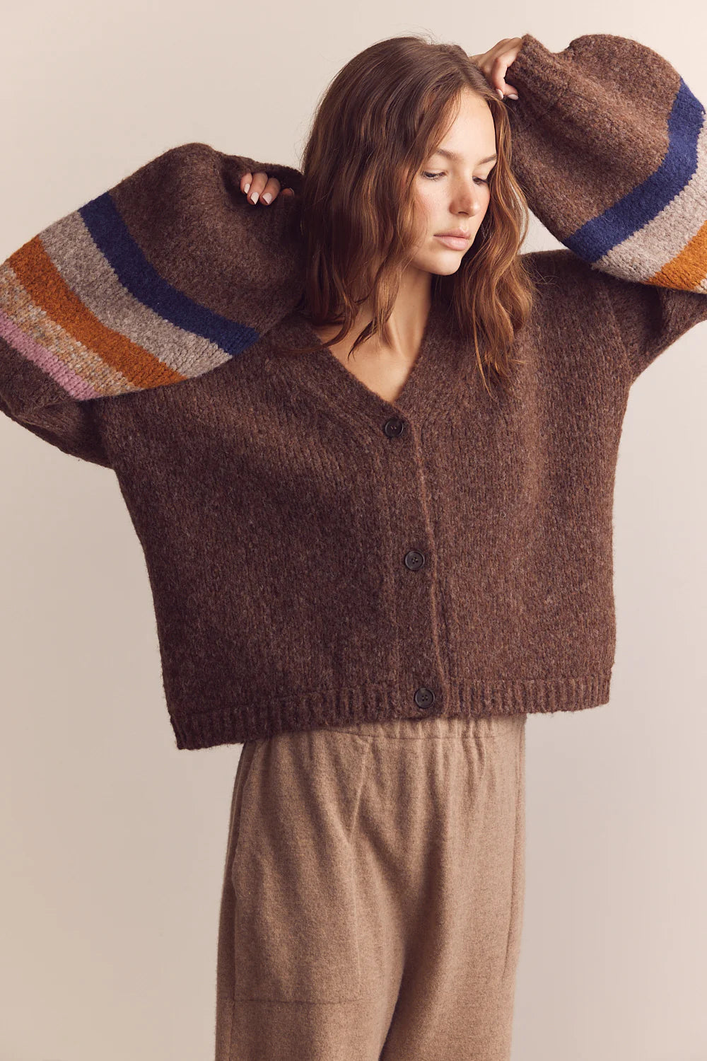 Price: $358.00 | A stunning cardigan knit from the softest baby alpaca, this sweater serves double duty as cozy layer and statement piece. Luxurious and timelessly crafted in Peru, this cardi features a relaxed body and oversized balloon sleeves with contrast stripes for visual impact. Finished with a flattering v-neck detail, this is one special piece and we are so excited to have share it with you. - 43% Baby Alpaca, 43% Merino Wool, 14% Polyamide - Made in Peru Color-pattern [ gid://shopify/Metaobject/81849319559 , gid://shopify/Metaobject/69781323911 ] Fabric [ gid://shopify/Metaobject/80644735111 , gid://shopify/Metaobject/80642343047 ] Sleeve-length-type [ gid://shopify/Metaobject/72505327751 ] Target-gender [ gid://shopify/Metaobject/68992958599 ] Top-length-type [ gid://shopify/Metaobject/80641622151 ] Age-group [ gid://shopify/Metaobject/68993056903 ] Neckline [ gid://shopify/Metaobject/69781651591 ] Size [ gid://shopify/Metaobject/68993351815 , gid://shopify/Metaobject/68993384583 ] Google product category 212 Google product category 212 Age group adult |
