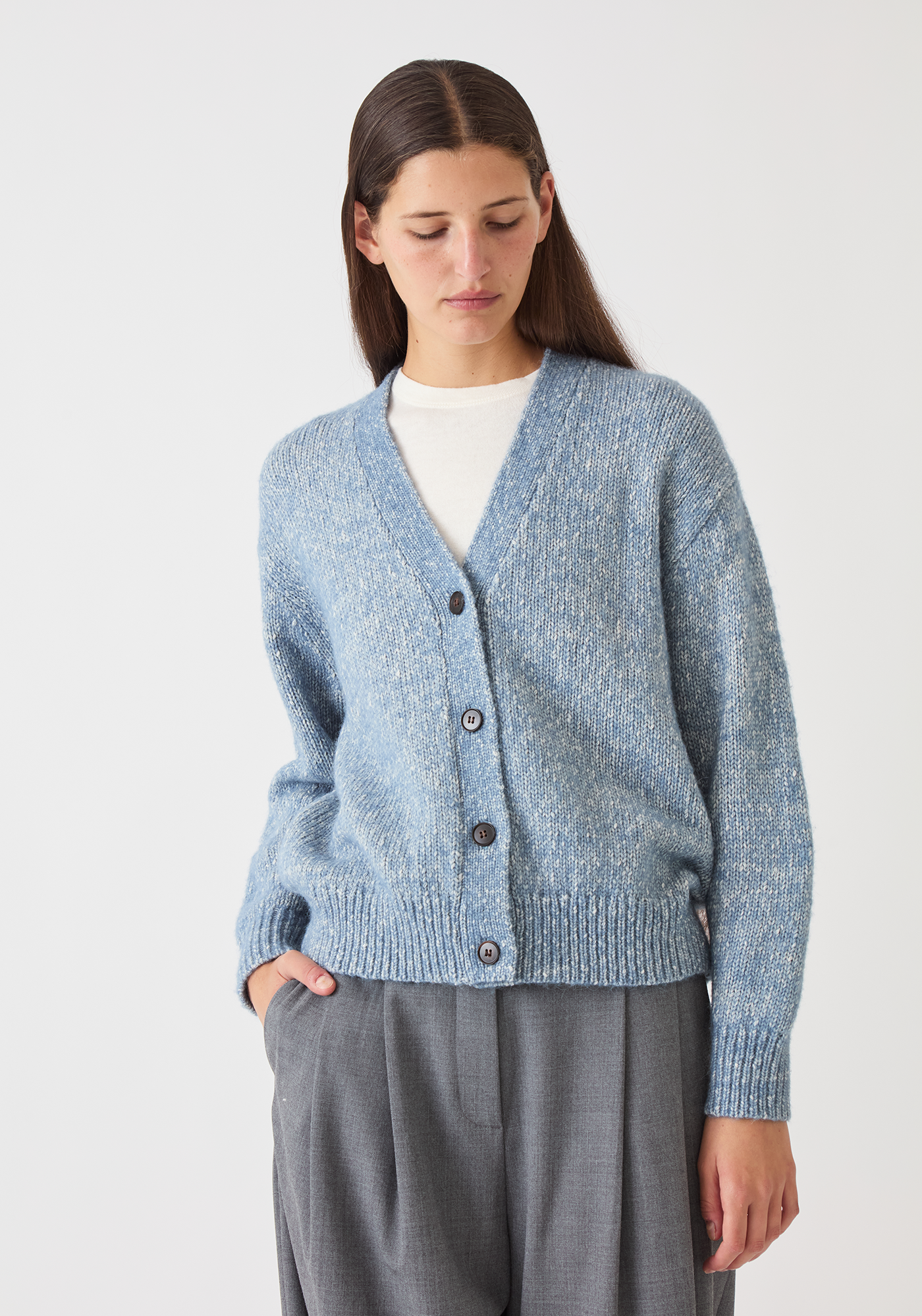 Price: $385.00 | Relaxed fit cardigan in speckled alpaca blend. Features slightly cropped length body and dropped shoulder. Rib trims throughout. 60% alpaca, 20% cotton, 20% wool Photographed in size small: Body length 22.5 Chest width 23 Sleeve length from shoulder 20.5 Fabrication Cotton-Alpaca-Wool Blend Wholesale usd 167 Collection type Seasonal Factory Hong Kong Material for ecom filter Wools Care tab product page Dry clean only. |