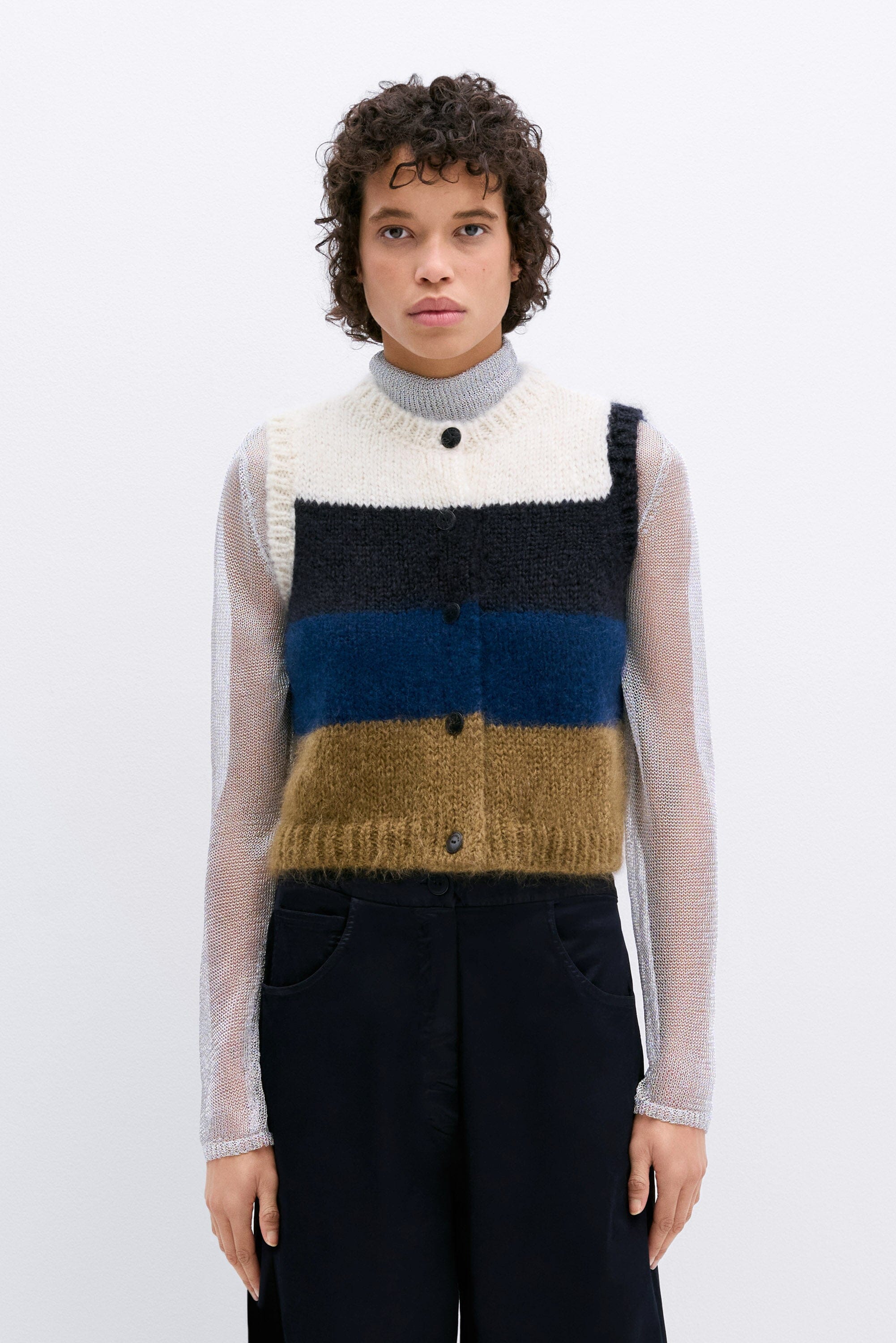 Price: $384.00 | Elevate your outfit with this special piece, a new variation of one of our best sellers. Boxy and cropped shape and oversize fit for this waistcoat made from high quality yarns mixture. Detailed with front buttons, stripes, round neck and wide armhole, perfect to layer with your favorite t-shirt or shirt. White Yarn and Black Yarn 59% Mohair 41% Biologic Wool Navy yarn 55% Baby Alpaca 20% Extrafine Merino Wool 25% Recycled Polyamide Moss yarn 67% Superkid Mohair 28% Recycled Nylon 5% Wool |