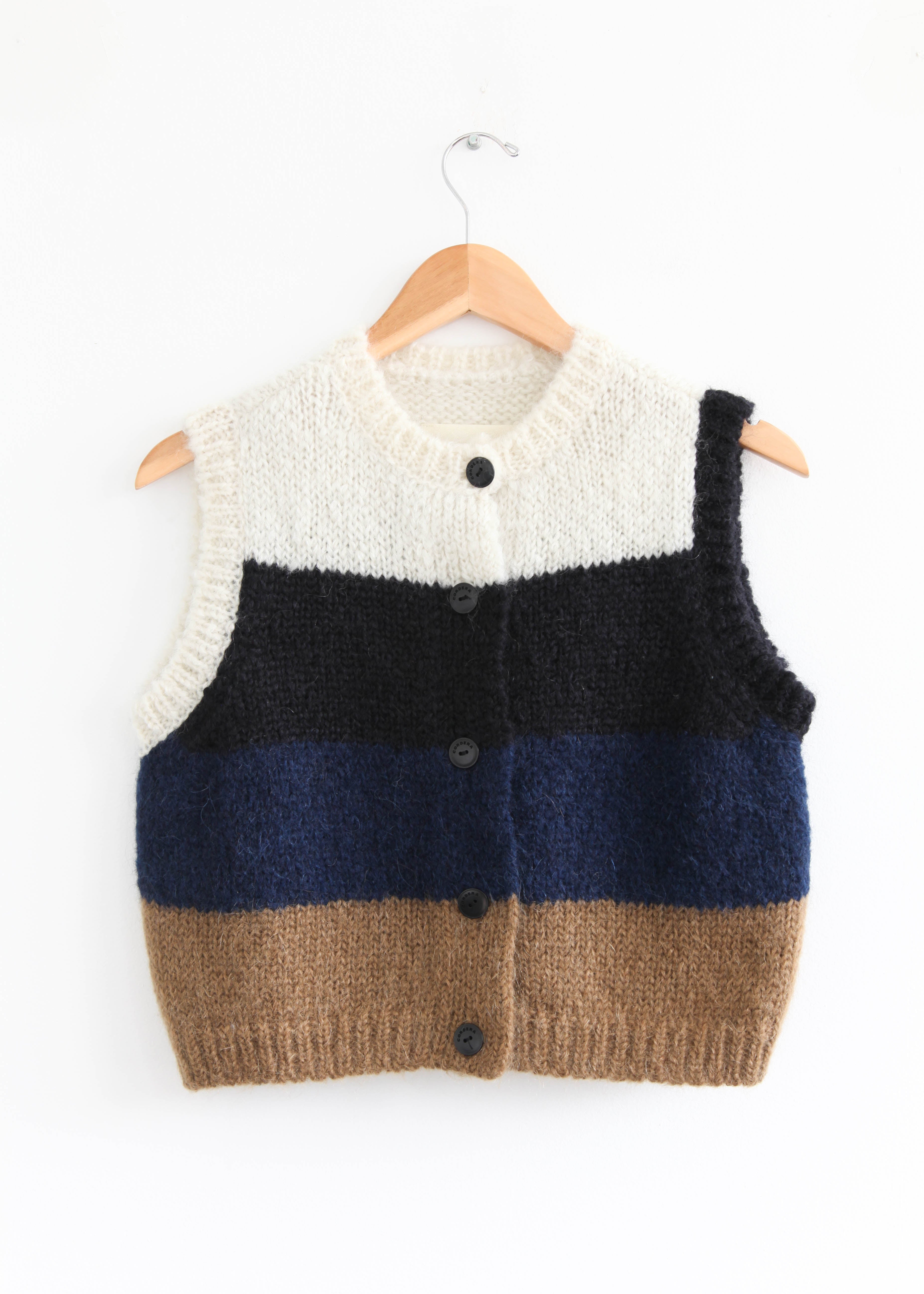 Price: $384.00 | Alpaca & Mohair Striped Waistcoat designed by Cordera. Elevate your outfit with this special piece, a new variation of one of our best sellers. Boxy and cropped shape and oversize fit for this waistcoat made from high quality yarns mixture. Detailed with front buttons, stripes, round neck and wide armhole, perfect to layer with your favorite t-shirt or shirt. Sizing + Details → - Made In Spain - White & Black Yarn — 59% Mohair, 41% Biologic Wool - Navy Yarn — 55% Baby Alpaca, 20% Extrafine Merino Wool, 25% Recycled Polyamide - Moss Yarn — 67% Superkid Mohair, 28% Recycled Nylon, 5% Wool - O/S — Size Range Runs As US 2 - US 8 - Lara Stands 5 8 And Wears O/S |