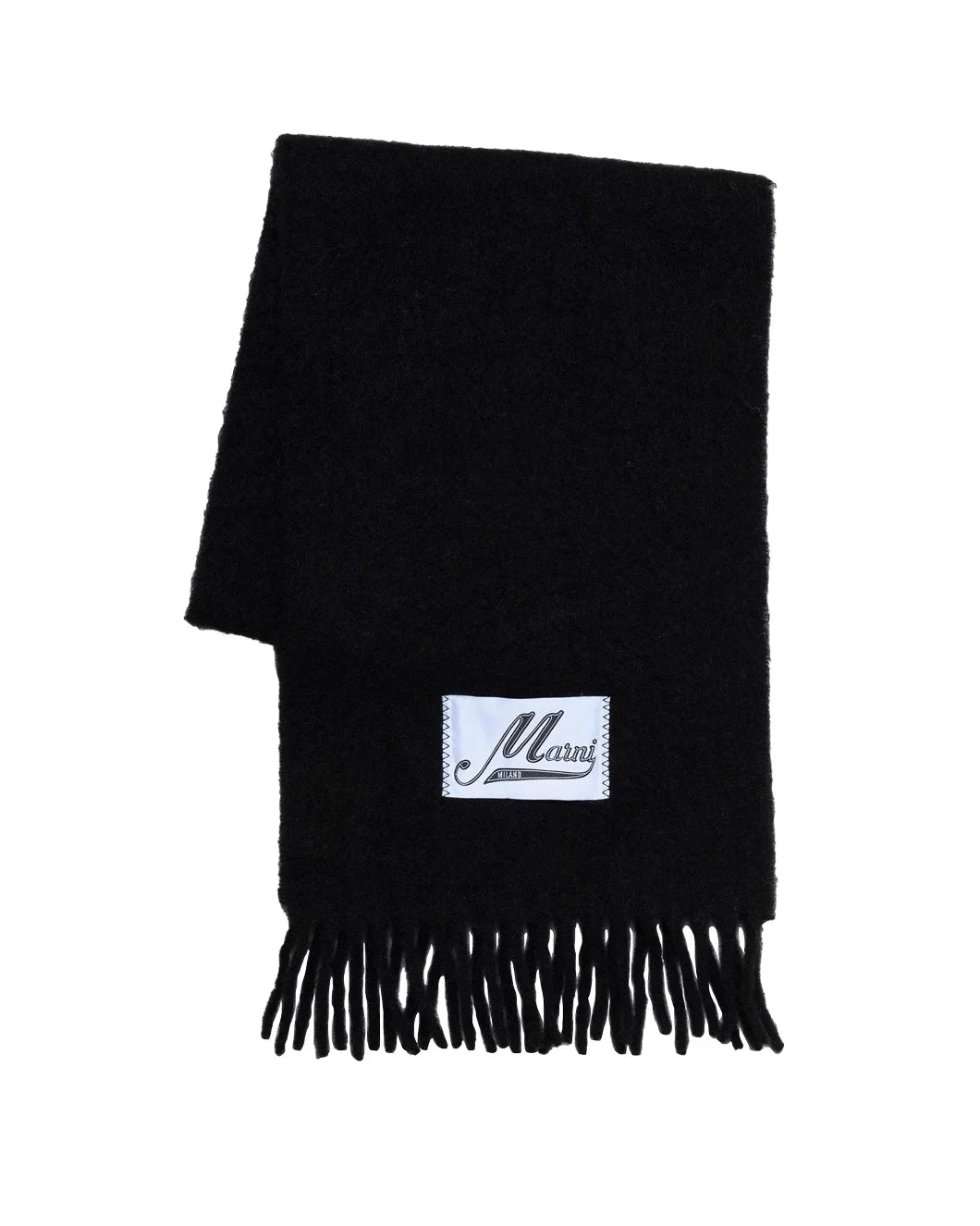 Price: $395.00 | The Black Alpaca Scarf in Black by is a fringed scarf featuring a stitched label, crafted in brushed wool. - 80% Alpaca Woven 20% Polyamide Woven |