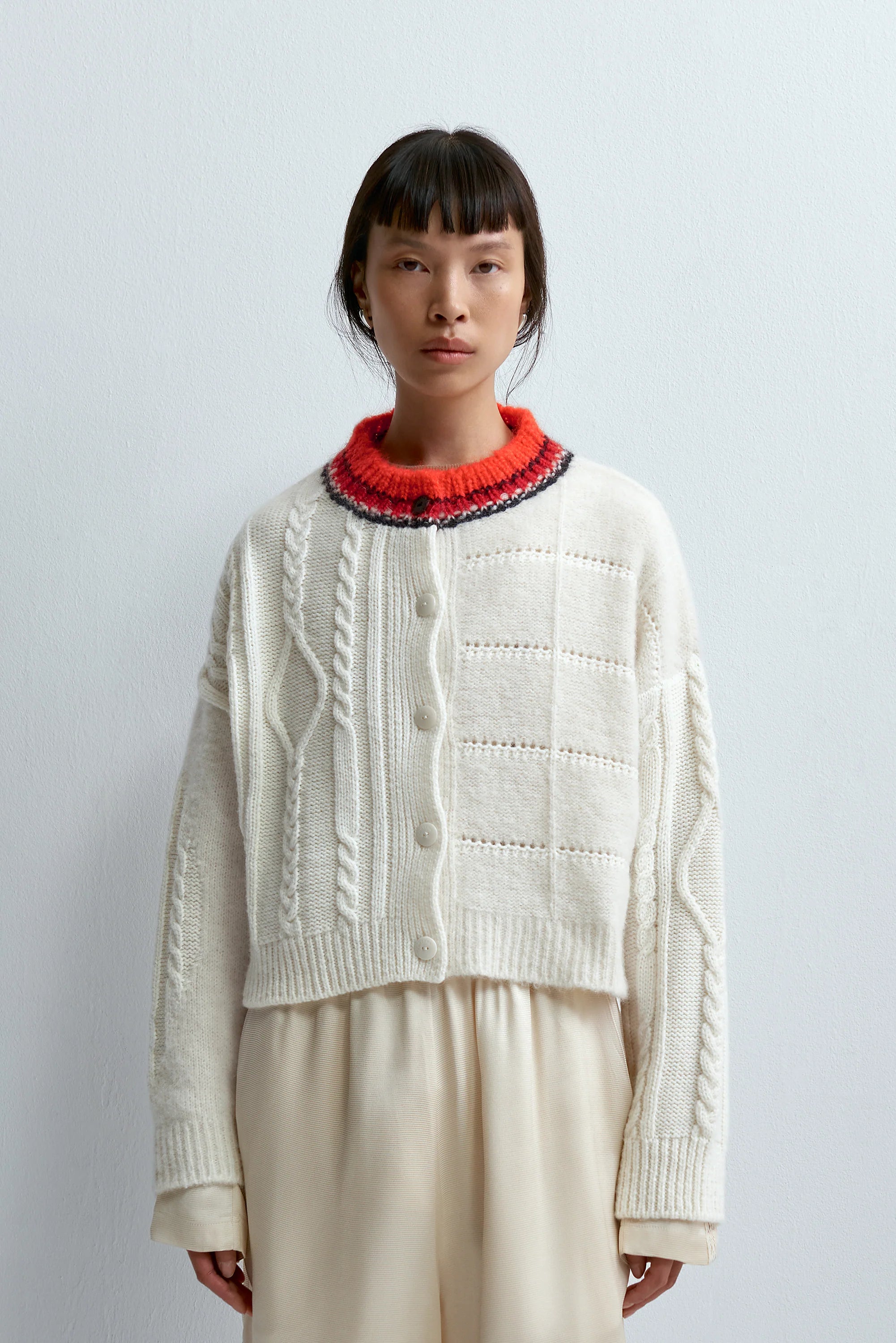 Price: $438.00 | Knitted from an alpaca blend that soft, warm, and tactile, this cardigan from is detailed with different textures, a round neckline, and button front. The vibrant red collar makes this piece more special for daily wear, and will be a refreshing addition to your seasonal palette. Ethically and carefully manufactured in La Coruña, Spain with Japanese knitting machines and finished by hand. DETAILS + FIT - 60% baby alpaca, 27% extrafine merino wool, 13% recycled polyamide - One size; fits EU 34 - 40 comfortably - Measurements laid flat: shoulder 19 , bust 25 , sleeve length from neck 29 , overall length 21 - Hand wash cold, lay flat to dry - Made in Spain |
