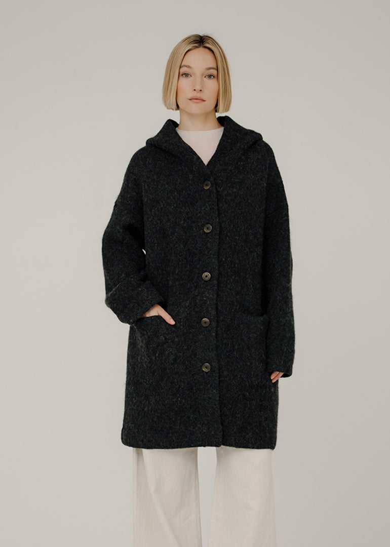 Price: $456.00 | Nook Alpaca Coat in Basalt Handcrafted from start to finish, the Nook Alpaca Coat is a true one-of-a-kind piece. Designed with a generous silhouette for effortless layering, it is hand loomed from a lightweight, voluminous blend of baby alpaca and merino wool. The coat features a classic button closure, front pockets, an oversized hood, and considered trims. -Ethically made in Lima, Peru. -70% baby alpaca, 23% recycled polyamide, 7% merino wool. -Hand loomed. -Five-button front closure. -Grown on front pockets. -Classic ribbing on hem. -Half milano trims on collar and cuffs. -Oversized, functional hood. -Dropped shoulders. -Full length sleeves. -Oversized Fit. -Available in two sizes, refer to general sizing below. -Model is wearing the XS/S. -Model is 5 9.5 and standard size medium. -If you are petite and between sizes, size down. -Reference our size chart for more information. General Sizing: -XS/S: 2-8 -M/L: 10-16 Flat Measurements ( Shoulder / Chest / Hem / Length): -XS/S: 25.5 / 25.5 / 25 / 32.5 -M/L: 27.5 / 27.5 / 27 / 34 *Allow for a variance of +/- 0.25-0.75 . *Shoulder width measured from seam to seam. *Chest measured from pit to pit. *Length measured from HSP. |