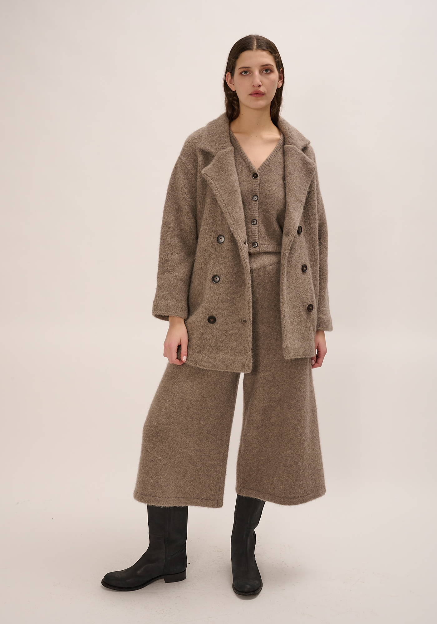 Price: $530.00 | Oversized knitted double breasted coat. Features on-seam pockets on seam. 31% alpaca, 31% yak, 22% nylon, 16% wool Photographed in size small: Body length 20.5 Chest width 18 Sleeve length from shoulder 22.5 |