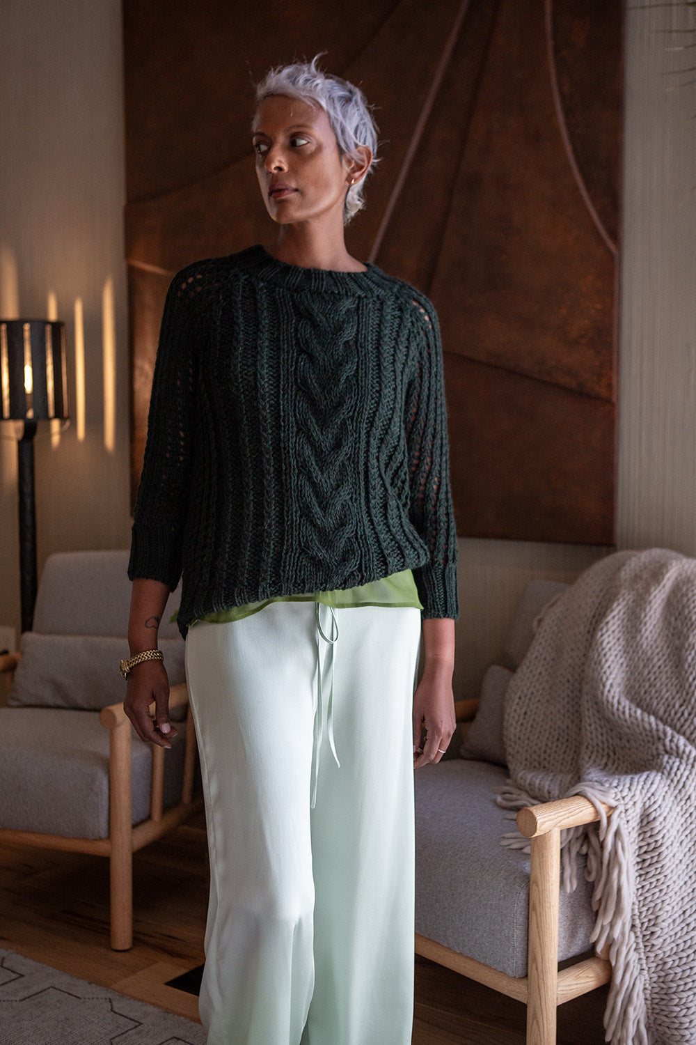 | Chunky knit Fisherman sweater in dark forest alpaca with front and back cable design, netting at raglan sleeves and sides, and rib finishing. Please note that each sweater is knit by hand, resulting in some length and fit variation. Details Handmade in Bolivia. 100% Baby Alpaca. Hand wash cold and dry flat.