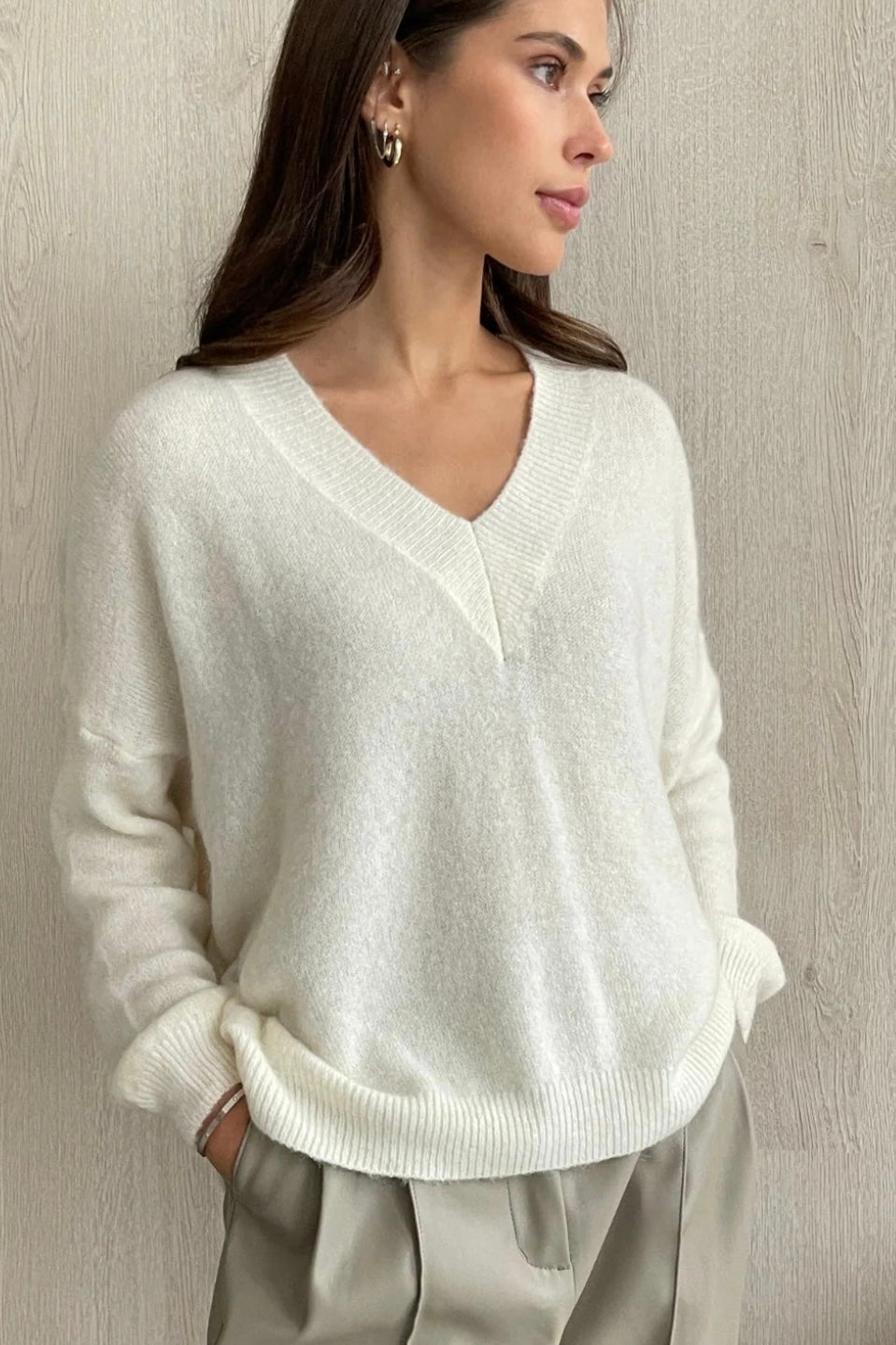 Price: $137.00 | April sweater is the softest v-neck sweater in fluffy no-itch Alpaca blend. Flattering v-neckline and relaxed fit for easy polished off-duty looks Details and Fit - Alpaca wool blend - Gentle wash - One Size - Relaxed Fit [Fits: UK 8-14 / US 4-10] - Valera is 5 6ft (167cm) and is UK Size 8 - Colour: Ivory - Made in Italy |