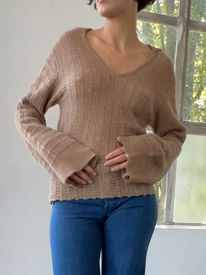 Price: $138.00 | Pale brown alpaca blend knit sweater. Slouchy fit with a v neck and collar. Ultra soft. In excellent condition - original tags still attached. Designer is Mozdeh Matin. MEASUREMENTS in inches Bust 37 Waist 34 Length 25 MATERIALS Baby alpaca, merino wool, recycled polymide |