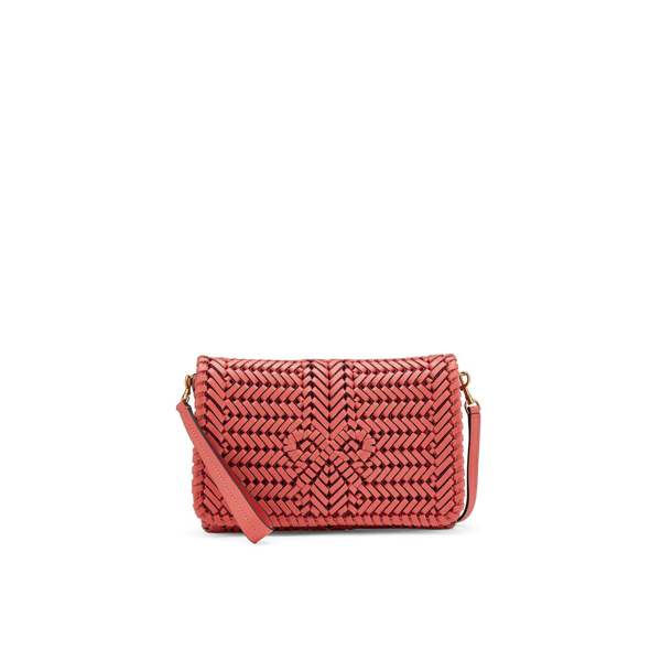 | Flamingo woven leather clutch with signature bow design. Foldover magnetic closure and interior card slots. 22 crossbody strap drop. 6.75 H x 9 L x 1.25 D.