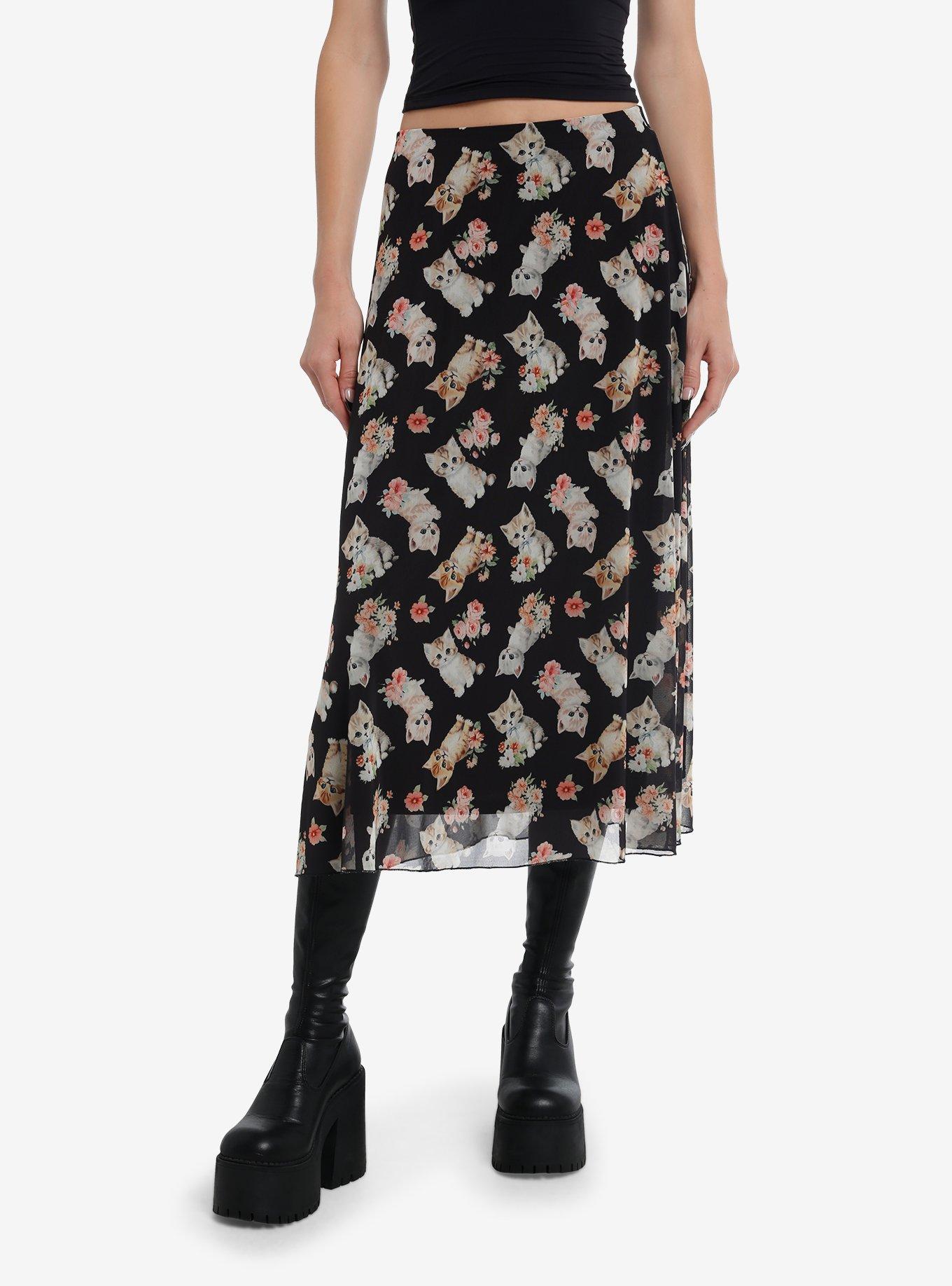 | lt div gt this skirt will have you purring uncontrollably it 39 s a mesh midi skirt that 39 s printed all over with throwback-style kittens and flowers. this skirt is lined. lt div gt lt div gt lt ul gt lt li gt 95 polyester 5 spandex lt li gt lt li gt wash cold dry low lt li gt lt li gt length 34 lt li gt lt li gt imported lt li gt lt li gt listed in junior sizes lt li gt lt li gt model is 5 39 10 lt li gt lt li gt model wears size small lt br gt lt li gt lt ul gt lt div gt 95 polyester 5 spandex