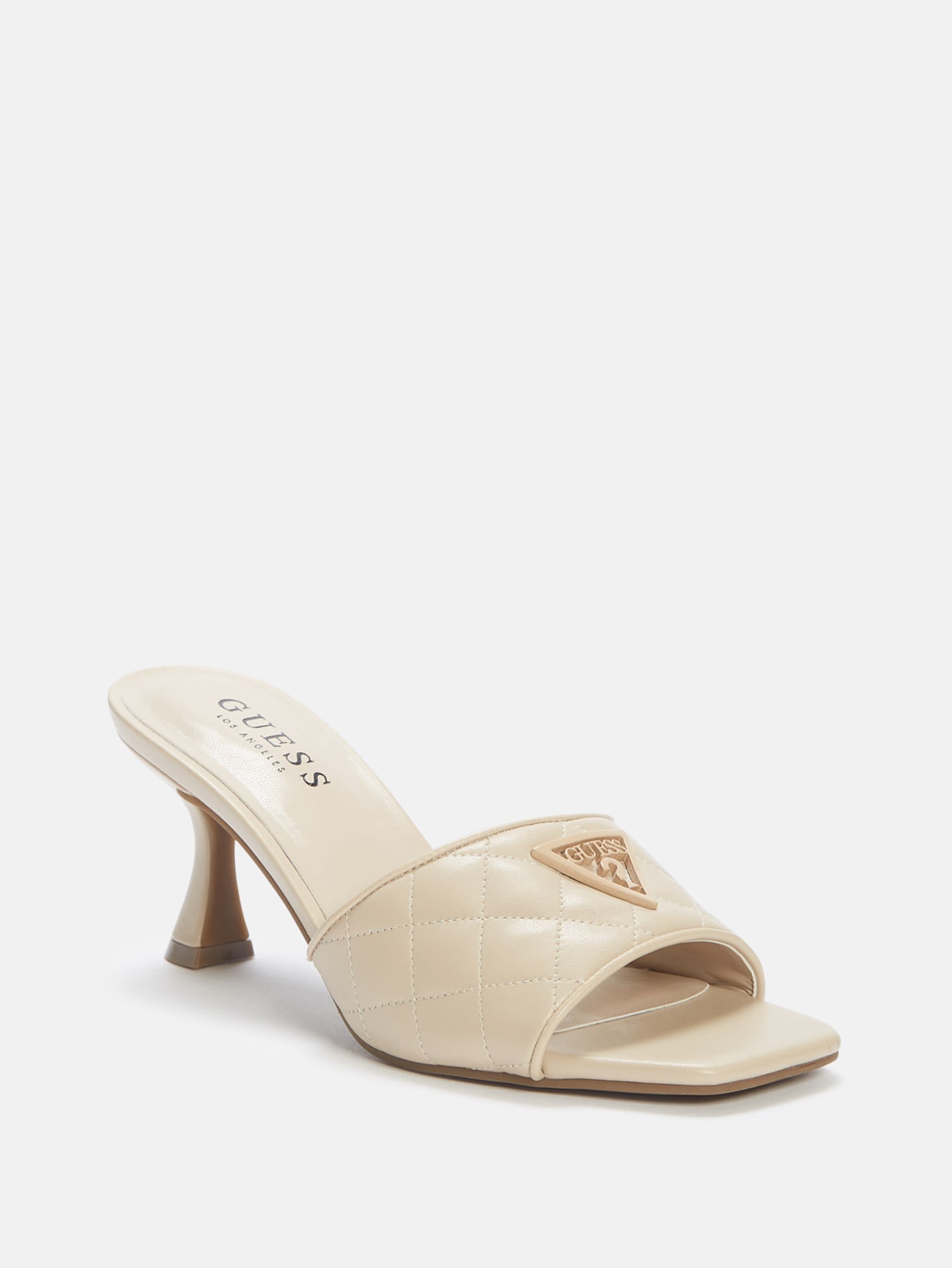 | faux-leather kitten heels diamond-quilted top band with enamel logo emblem open square toe flared kitten heel slips on 2.5 heel material synthetic material synthetic