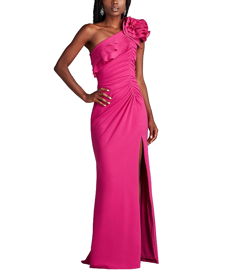 | About The Brand:This signature crepe gown features a one-shoulder silhouette adorned with delicate pleats that gracefully converge into a breathtaking rosette detail.