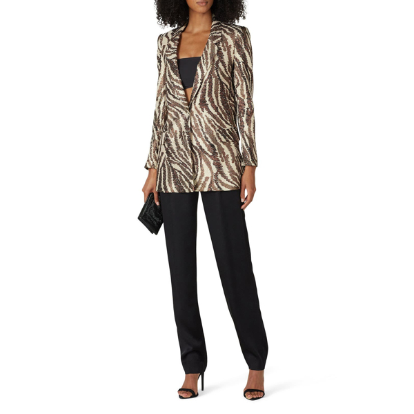 | Brown and white zebra printed jacquard (80% Polyester, 20% Metallic). Jacket. Long sleeves. Front button closure. Fully lined. Front Pockets. 30 from shoulder to hemline. Imported.