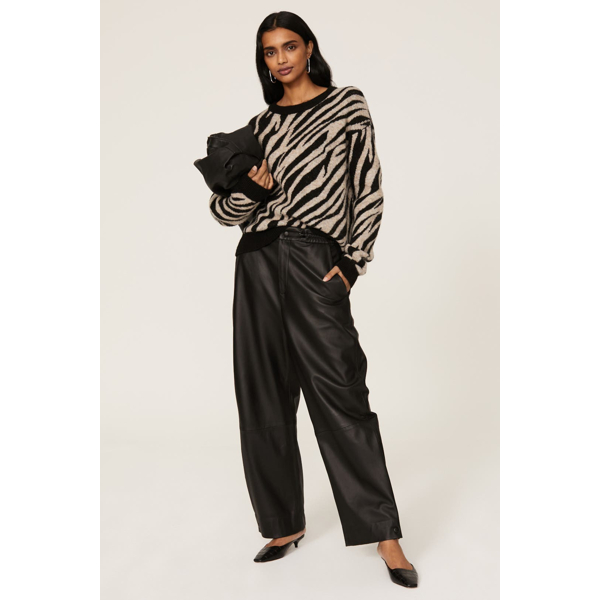 | Black and white zebra-printed knit (68% Acrylic, 21% Nylon, 8% Wool, 3% Spandex). Sweater. Crew neck. Long sleeves. Pull-on. 24.5 from shoulder to hemline. Imported.